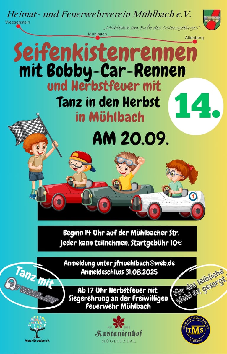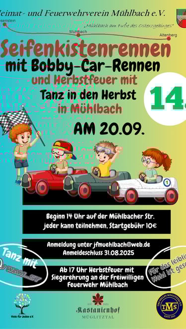 Am 20.09.2025 findet mit uns in Cooperation das alljährliche Seifenkisten- und Bobby-Car-Rennen statt.